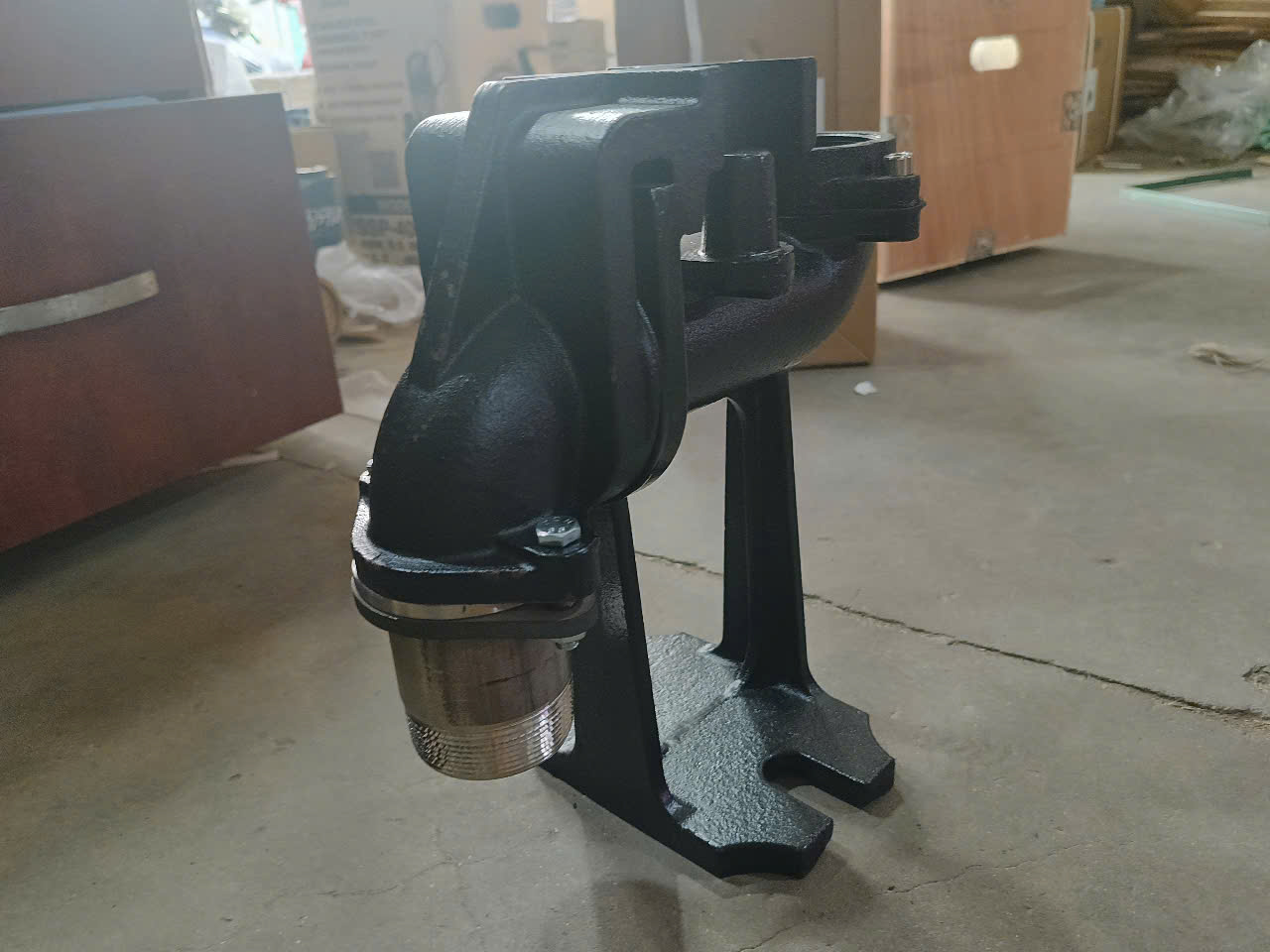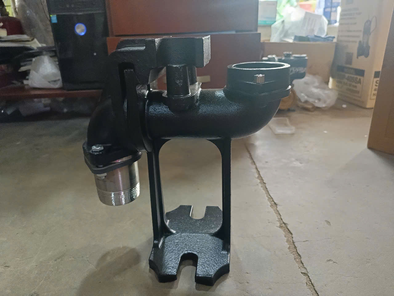 Cấu tạo: gồm đế đúc gang/inox, khớp nối, thanh ray trượt và móc treo bơm. Khi thả bơm xuống, bơm sẽ tự động khớp kín với đế xả.