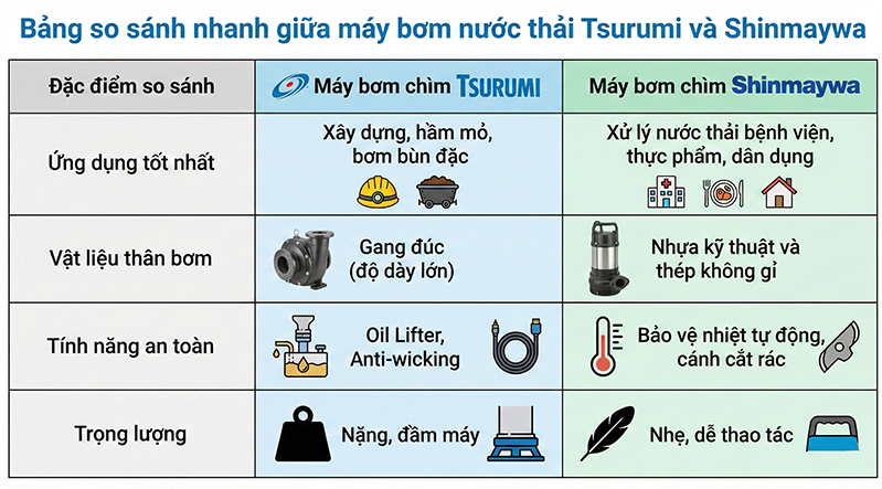 Trả lời: Tùy vào nhu cầu. Nếu bơm nước thải lẫn cát sỏi, bùn đặc, hãy chọn Tsurumi. Nếu bơm nước thải sạch hoặc có rác xơ, cần chống ăn mòn hóa chất, hãy chọn Shinmaywa.
